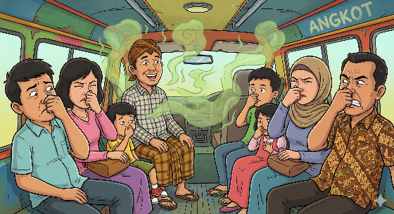 Sorana tarik pisan, siga knalpot motor racing bobok. Bauna langsung nyebar minuhan angkot, meledug nepi ka panon peurih.