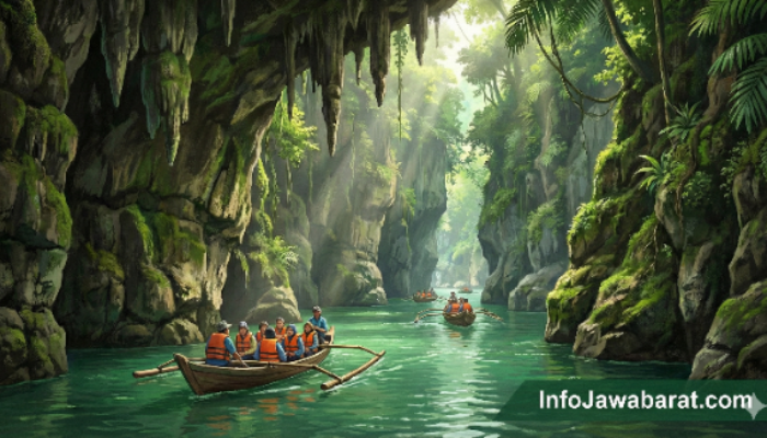 PANGANDARAN, InfoJawabarat.com – Bayangkan sebuah lorong sungai purba yang diapit oleh tebing-tebing batu menjulang tinggi, di mana sinar matahari berjuang menerobos celah dedaunan rimbun untuk menyinari air sungai yang berwarna hijau toska nan jernih. Suara tetesan air dari stalaktit berpadu dengan deburan arus sungai, menciptakan orkestra alam yang menenangkan sekaligus memacu adrenalin.