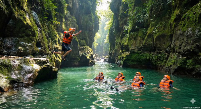 2. Lompatan Adrenalin (Cliff Jumping): Ini adalah menu favorit para pencari sensasi. Terdapat beberapa titik lompatan tebing, mulai dari ketinggian 3 meter, 5 meter, hingga yang paling ekstrem mencapai 7-9 meter (batu payung). Tentu saja, ini opsional. Jika tidak berani, Anda bisa berjalan memutar lewat jalur air biasa.